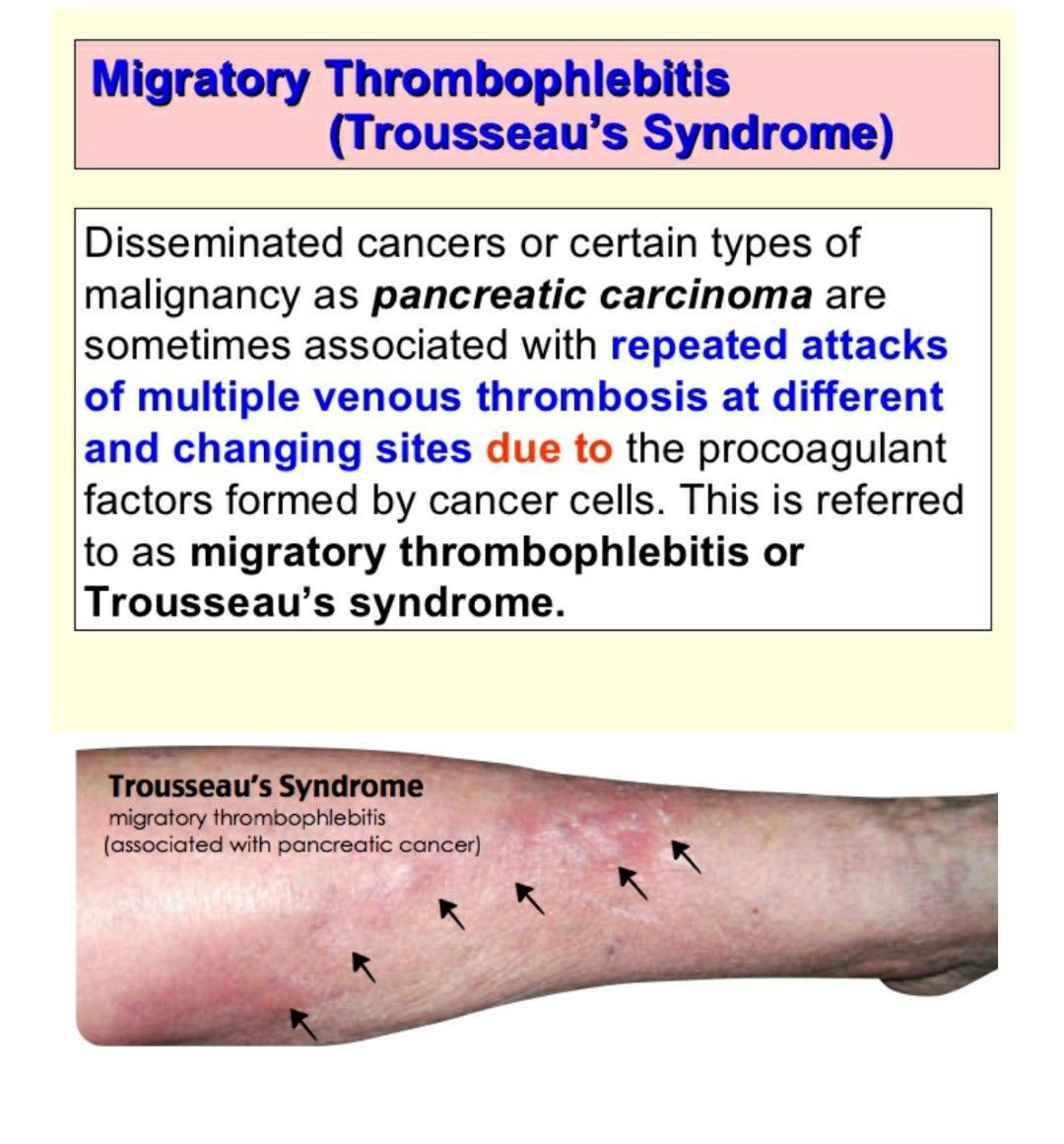 What are the clinical features of Trousseau syndrome? Superficial thrombophlebitis may involve either the arterial or venous system. Lesions appear as inflamed, reddened lines or lumps in the fat under the skin. They may occur on the trunk or extremities