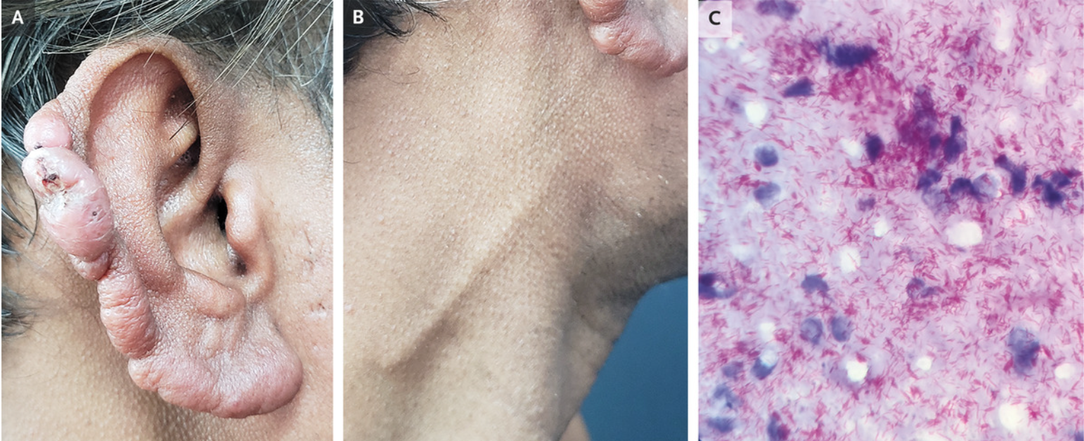A 40-year-old man presented to the dermatology clinic with a 1-year history of painless swelling of his earlobes. He also reported having nasal congestion and intermittent nosebleeds. On examination, painless, indurated, contiguous nodules along the helixes of both ears were observed (Panel A). Thickening of the greater auricular nerve (Panel B) on both sides and patchy loss of sensation in the distal arms and legs were also present. Dermal fluid was obtained from an incision in the earlobe for a skin smear, which was stained with the use of the modified Ziehl–Neelsen method and examined under an oil-immersion lens. The skin smear showed innumerable acid-fast bacilli (Panel C). A diagnosis of lepromatous leprosy was made. Leprosy, also known as Hansen’s disease, is a chronic infection involving the skin and nerves that is caused by Mycobacterium leprae complex. Lepromatous leprosy, the most severe form, is characterized by a weak immune response and high burden of organisms. Patients with lepromatous leprosy often present with diffuse skin involvement and even infiltration of the nasal mucosa, as was observed in this patient. A 12-month course of uniform multidrug therapy was prescribed, but the patient was lost to follow-up after 2 months. Shekhar Neema, M.D. Santosh Battula, M.B., B.S. Armed Forces Medical College, Pune, India source: nejm.org