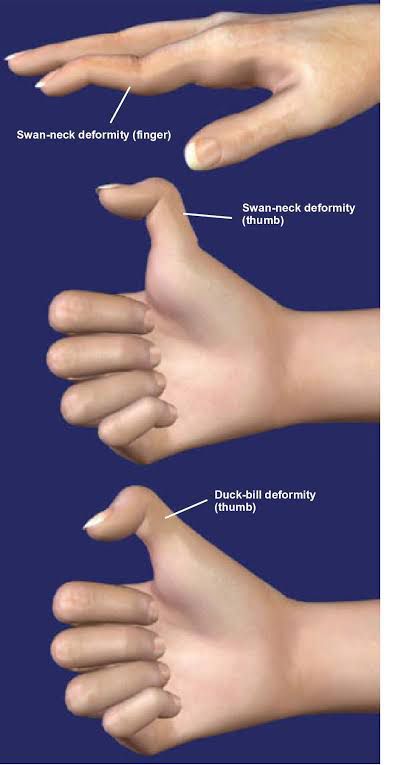 Swan-neck deformity is a bending in (flexion) of the base of the finger, a straightening out (extension) of the middle joint, and a bending in (flexion) of the outermost joint. . Other causes include untreated mallet finger. It is usually caused by a tendon injury.