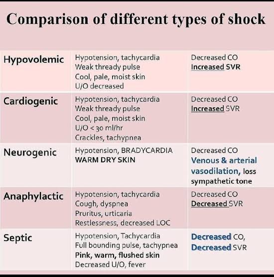There are four subtypes of shock with differing underlying causes and symptoms: hypovolemic, cardiogenic, obstructive, and distributive. Distributive shock can be further divided into septic, anaphylaxis, and neurogenic shock.