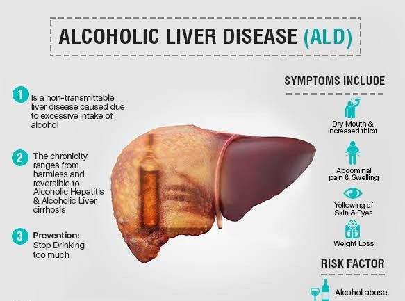 Alcohol-related liver disease (ARLD) refers to liver damage caused by excess alcohol intake. There are several stages of severity and a range of associated symptoms. ARLD doesn't usually cause any symptoms until the liver has been severely damaged. When this happens, symptoms can include: feeling sick weight loss loss of appetite yellowing of the eyes and skin (jaundice) swelling in the ankles and tummy confusion or drowsiness vomiting blood or passing blood in your stools This means ARLD is frequently diagnosed during tests for other conditions, or at a stage of advanced liver damage. If you regularly drink alcohol to excess, tell your GP so they can check if your liver is damaged.