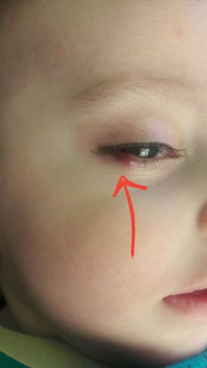 Stye. Hold warm to hot wet wash cloth on eye for around 10-15 minutes. If no improvement, antibiotics against Staphylococcus aureus