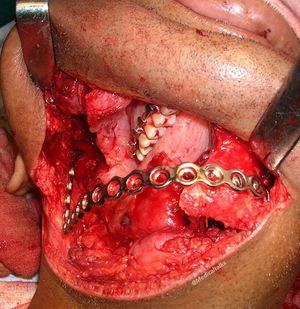 Hemimandibulectomy using submandibular approach due to a multi-cystic ameloblastoma on the lower jaw and reconstruction with a titanium bar!! Ameloblastoma is a rare, benign tumor of odontogenic epithelium much more commonly appearing in the mandible than the maxilla. While these tumors are rarely malignant or metastatic (benign, they rarely spread to other parts of the body), and progress slowly, the resulting lesions can cause severe abnormalities of the face and jaw. On gross pathology, the characteristic findings of ameloblastoma may include solid and cystic, mulitcystic and intraosseous or extraosseous, or rarely unicystic. In many cases, the first sign is painless swelling in the jaw. The etiology is not fully established, and in most cases it presents as an asymptomatic, slow growing tumors, with high rate of recurrence if it's not removed predominantly by a radical surgical resection. In an effort to prevent recurrence, a wide margin of healthy tissue should be removed from the area surrounding the tumor The surgery is followed by the reconstruction of the defects. The picture shows a missing potion of the mandible following a segmental mandibulectomy and reconstruction using a stainless steel titanium plate. Segmental mandibulectomy is indicated for the resection of tumors with gross bone invasion. Photo by @medical_gossips