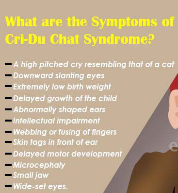 Symptoms of cri du chat syndrome .A high-pitched, cat-like cry or weak cry. .Low birth weight. .A small head. .A rounded face. .A broad, flattened bridge of the nose. .Eyes spaced wide apart. .Folds of skin over the eyelids. .Abnormalities of the palate, such as an unusually narrow and high palate.