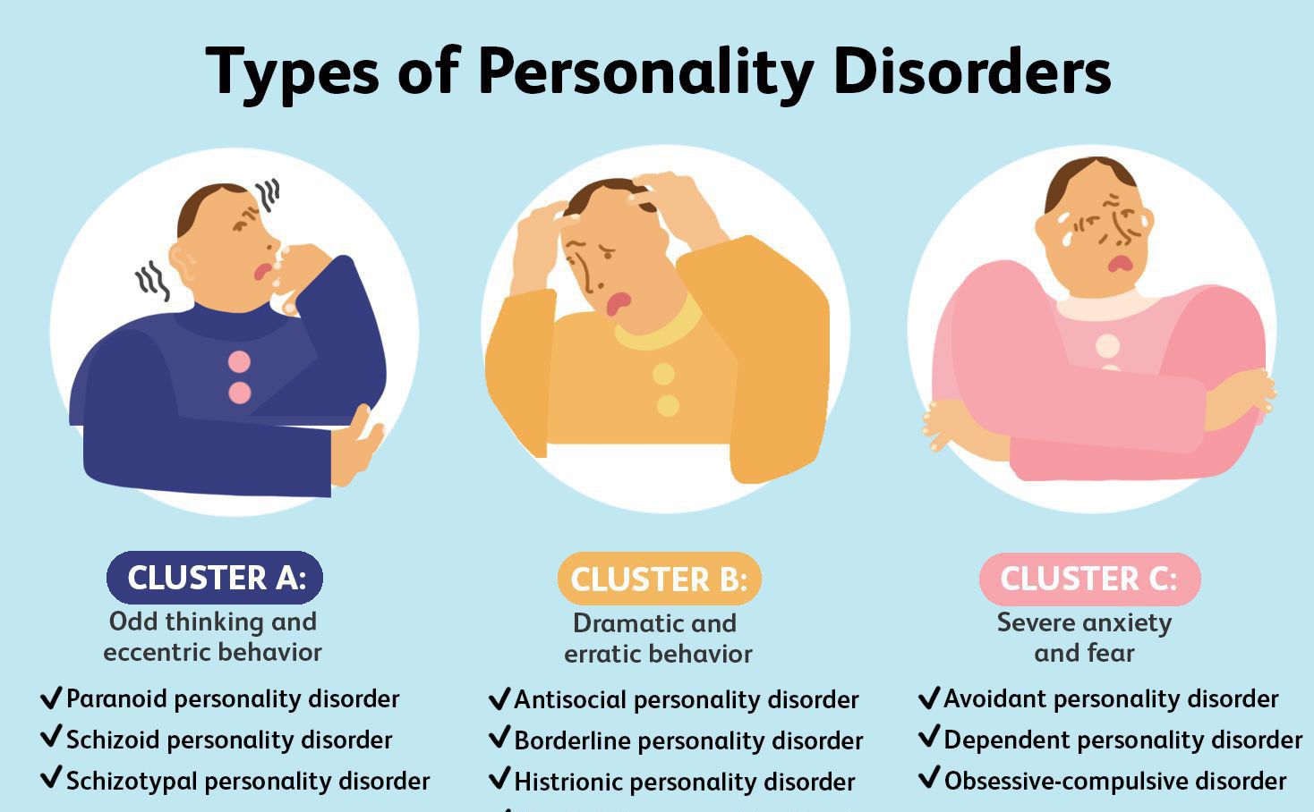 Dependent personality disorder. Obsessive compulsive personality disorder (OCPD) Emotional and impulsive: Antisocial personality disorder (ASPD) Borderline personality disorder (BPD) Histrionic personality disorder. Narcissistic personality disorder.
