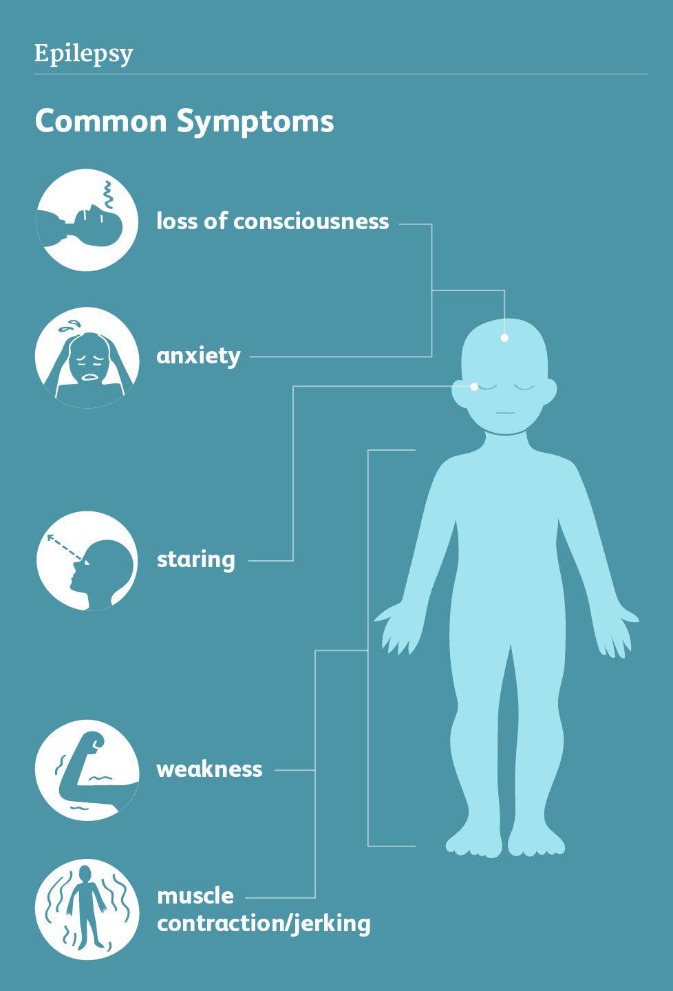 Symptoms Temporary confusion. A staring spell. Stiff muscles. Uncontrollable jerking movements of the arms and legs. Loss of consciousness or awareness. Psychological symptoms such as fear, anxiety or deja vu.