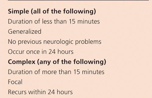 There are two main types of febrile seizure. Simple febrile seizure A simple febrile seizure is the most common type of febrile seizure, accounting for about eight out of 10 cases. It's a fit that: is a tonic clonic seizure (see above) lasts less than 15 minutes doesn't reoccur within 24 hours or the period in which your child has an illness Complex febrile seizure Complex febrile seizures are less common, accounting for two out of 10 cases. A complex febrile seizure is any seizure that has one or more of the following features: the seizure lasts longer than 15 minutes your child only has symptoms in one part of their body (this is known as a partial or focal seizure) your child has another seizure within 24 hours of the first seizure, or during the same period of illness your child doesn't fully recover from the seizure within one hour