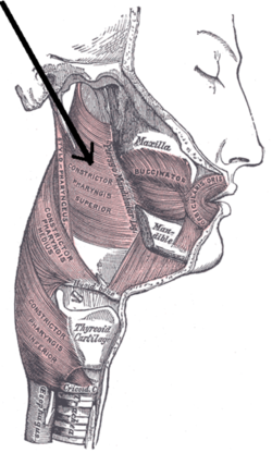 The superior constrictor muscle originates from the pterygoid process, posterior end of the mylohyoid line of mandible, and the pterygomandibular ligament/raphe. This superior constrictor muscle inserts into the base of the skull at the pharyngeal tubercle and the pharyngeal raphe.