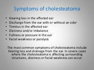 The 2 most common symptoms are: a persistent or recurring watery, often smelly, discharge from the ear, which can come and go or may be continuous. a gradual loss of hearing in the affected ear.