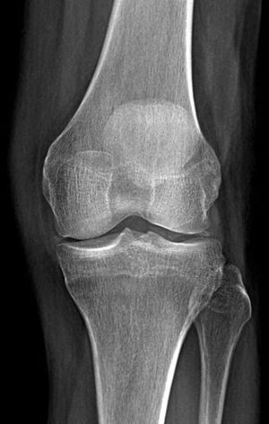 Could be Osteoarthritis with the non uniform joint space narrowing and eburnation (bony sclerosis) margin of the bone is whiter there could be spiking of tibial condyle. Diagnosed by joint pain, morning stiffness, absence of constitutional symptoms and on examination there will be increased bony prominence at the joint margins anf atrophy of surrounding muscle, there could be grating sensation with tenderness over the joint line and joint movement limitation