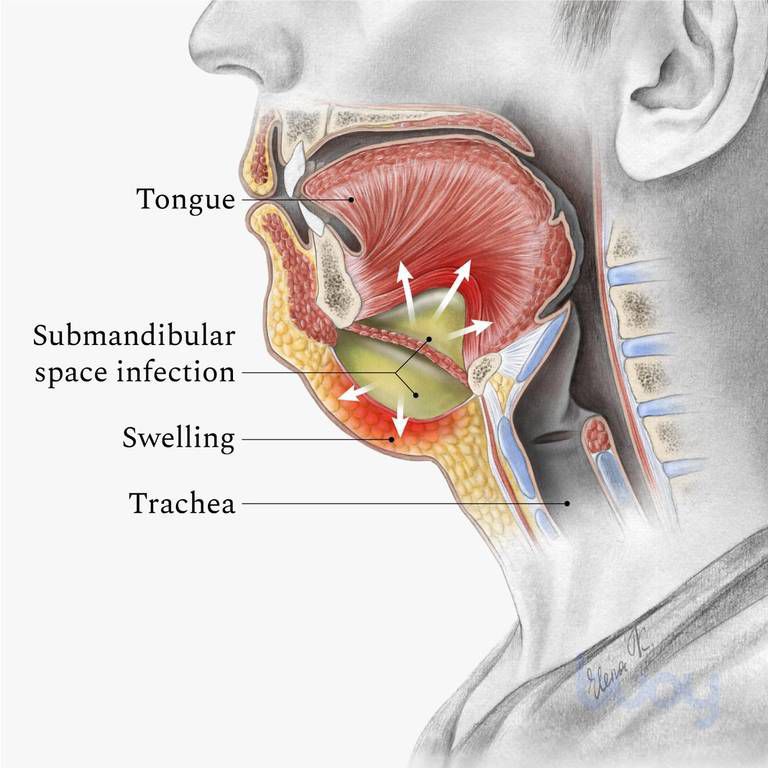 Ludwig angina is a type of bacterial infection that occurs in the floor of the mouth, under the tongue. It often develops after an infection of the roots of the teeth (such as tooth abscess) or a mouth injury. This condition is uncommon in children.