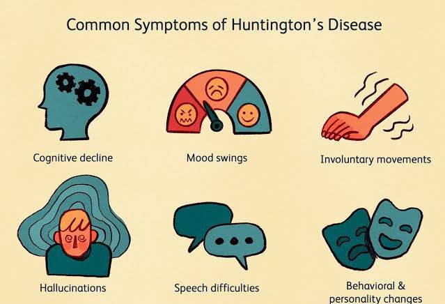 The clinical features of Huntington's disease can include psychiatric problems and difficulties with behaviour, feeding, communication and abnormal movements. People can start to show the features of Huntington's disease at almost any age, but most will develop problems between the ages of 35 and 55. The condition usually progresses and gets worse for around 10-25 years, until the person eventually dies. Signs and symptoms may vary between individuals and there's no typical pattern. Early features, such as personality changes, mood swings and unusual behaviour, are often overlooked at first and attributed to something else. Some people with Huntington's disease may not recognise that they have any problems.