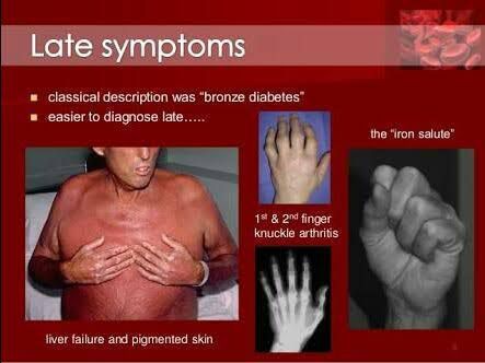 Fatigue. Joint pain – particularly affecting the fingers. Unexplained bronzing or tanning of the skin. Erectile dysfunction. Missed periods. Increased urination. Thirst. Loss of body hair.