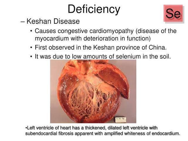 Keshan disease (KD) is a dilated cardiomyopathy closely related with a diet deficient in the mineral selenium. It is named for the northeastern Chinese county Keshan, where the disease prevalence is high because of selenium-deficient soil.