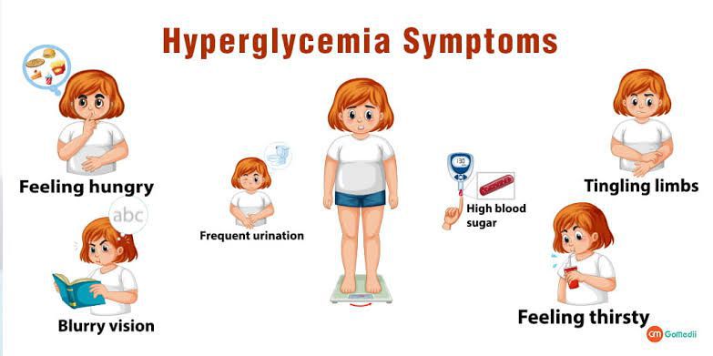 Symptoms of hyperglycaemia in people with diabetes tend to develop slowly over a few days or weeks. In some cases, there may be no symptoms until the blood sugar level is very high. Symptoms of hyperglycaemia include: increased thirst and a dry mouth needing to pee frequently tiredness blurred vision unintentional weight loss recurrent infections, such as thrush, bladder infections (cystitis) and skin infections Symptoms of hyperglycaemia can also be due to undiagnosed diabetes, so see your GP if this applies to you. You can have a test to check for the condition