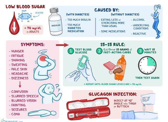 The immediate treatment for hypoglycaemia is to have some food or drink that contains sugar, such as dextrose tablets or fruit juice, to correct your blood glucose levels. After having something sugary, you may need to have a longer-acting "starchy" carbohydrate food, such as a sandwich or a few biscuits. If hypoglycaemia causes a loss of consciousness, an injection of the hormone glucagon can be given to raise blood glucose levels and restore consciousness. This is only if an injection is available and the person giving the injection knows how to use it. You should dial 999 to request an ambulance if: a glucagon injection kit isn't available there's nobody trained to give the injection the injection is ineffective after 10 minutes Never try to put food or drink into the mouth of someone who's drowsy or unconscious as they could choke. This includes some of the high-sugar preparations specifically designed for smearing inside the cheek.