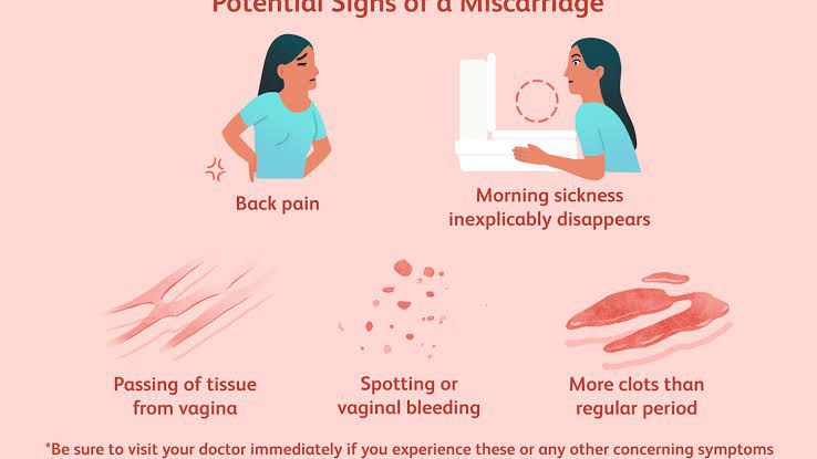 Symptoms of an early miscarriage You might be having an early miscarriage if: you're bleeding from your vagina you've cramps in your lower abdomen – these can feel like bad period pains there's fluid or tissue coming from your vagina your breasts are no longer tender and any morning sickness has passed Symptoms of a late miscarriage You might be having a late miscarriage if: you're bleeding from your vagina – this can be heavy and you might have blood clots you've strong, cramping pains Always get medical help if: you're bleeding your baby’s movements have changed or you haven’t felt any movements for a while. your waters break and your baby's born very quickly