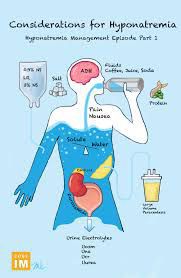 Causes Sodium plays a key role in your body. It helps maintain normal blood pressure, supports the work of your nerves and muscles, and regulates your body's fluid balance. A normal blood sodium level is between 135 and 145 milliequivalents per liter (mEq/L). Hyponatremia occurs when the sodium in your blood falls below 135 mEq/L. Many possible conditions and lifestyle factors can lead to hyponatremia, including: Certain medications. Some medications, such as some water pills (diuretics), antidepressants and pain medications, can interfere with the normal hormonal and kidney processes that keep sodium concentrations within the healthy normal range. Heart, kidney and liver problems. Congestive heart failure and certain diseases affecting the kidneys or liver can cause fluids to accumulate in your body, which dilutes the sodium in your body, lowering the overall level. Syndrome of inappropriate anti-diuretic hormone (SIADH). In this condition, high levels of the anti-diuretic hormone (ADH) are produced, causing your body to retain water instead of excreting it normally in your urine. Chronic, severe vomiting or diarrhea and other causes of dehydration. This causes your body to lose electrolytes, such as sodium, and also increases ADH levels. Drinking too much water. Drinking excessive amounts of water can cause low sodium by overwhelming the kidneys' ability to excrete water. Because you lose sodium through sweat, drinking too much water during endurance activities, such as marathons and triathlons, can also dilute the sodium content of your blood. Hormonal changes. Adrenal gland insufficiency (Addison's disease) affects your adrenal glands' ability to produce hormones that help maintain your body's balance of sodium, potassium and water. Low levels of thyroid hormone also can cause a low blood-sodium level. The recreational drug Ecstasy. This amphetamine increases the risk of severe and even fatal cases of hyponatremia