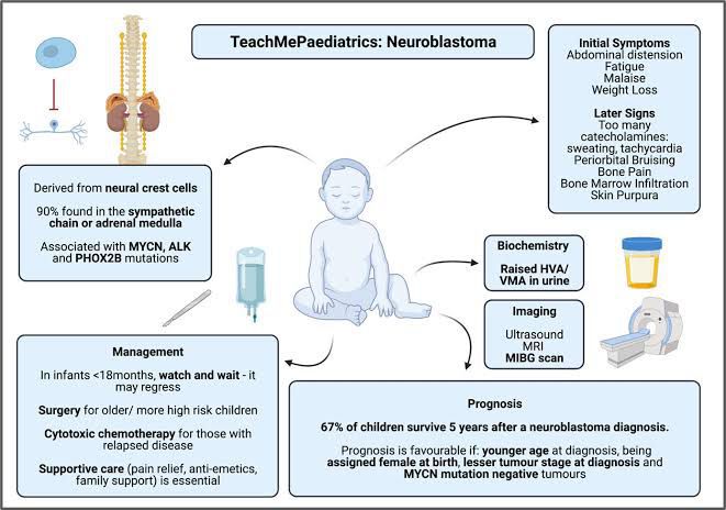 A variety of tests and investigations will be needed to diagnose neuroblastoma. These include a biopsy of the tumour, blood and bone marrow tests, X-rays, CT or MRI scans, and a special nuclear medicine scan called an MIBG scan. These tests are carried out to confirm the diagnosis of neuroblastoma, and to find the exact position of the original site of neuroblastoma within the body and to see whether it has spread. This process is known as staging. A specific type of urine test will also be done. Nearly all children with neuroblastoma (9 out of 10) will have substances called vanillylmandelic acid (VMA), or homovanillic acid (HVA), in their urine. Measuring the VMA and HVA in the urine can help to confirm the diagnosis. Your child will also have their VMA and HVA levels checked during and after treatment. The levels of these substances will fall if the treatment is working. As these chemicals are produced by the tumour cells, and can be used to measure tumour activity, they are sometimes known as tumour markers. Most children will have an MIBG (meta-iodo-benzyl guanidine) scan. MIBG is a substance that’s taken up by neuroblastoma cells. It’s given by injection into the blood stream. Attaching a small amount of radioactive iodine to the MIBG enables any neuroblastoma tissue to be seen by a radiation scanner. Sometimes MIBG can be used as a treatment.