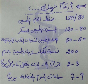 In Arabic ; important numbers u must know 120/80 normal BP level 120/80 normal BG level 80/60 normal Heartbeat/min 200 normal cholesterol level 2/3 litres of water daily needed 7/9 hours of sleep