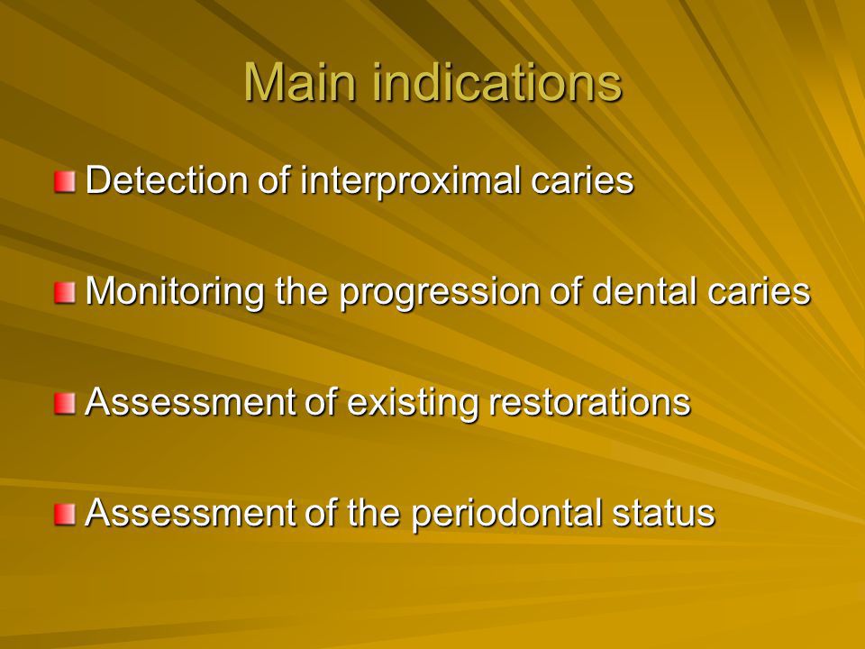 Bitewing radiographs are indicated primarily to detect or monitor interproximal caries if the proximal surfaces of the teeth cannot be visually or tactilely examined.