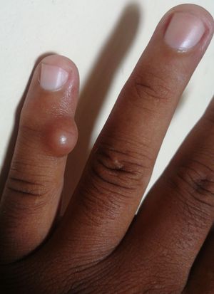 Any specific history? Maybe epidermal cyst or blister due to chemicals or heat?