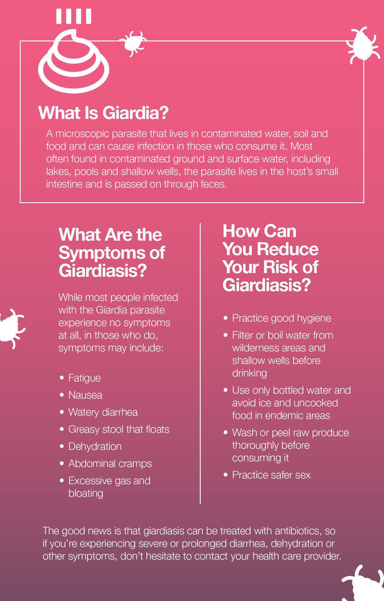 What are the symptoms of giardiasis? Diarrhea. Gas. Foul-smelling, greasy poop that can float. Stomach cramps or pain. Upset stomach or nausea. Dehydration.