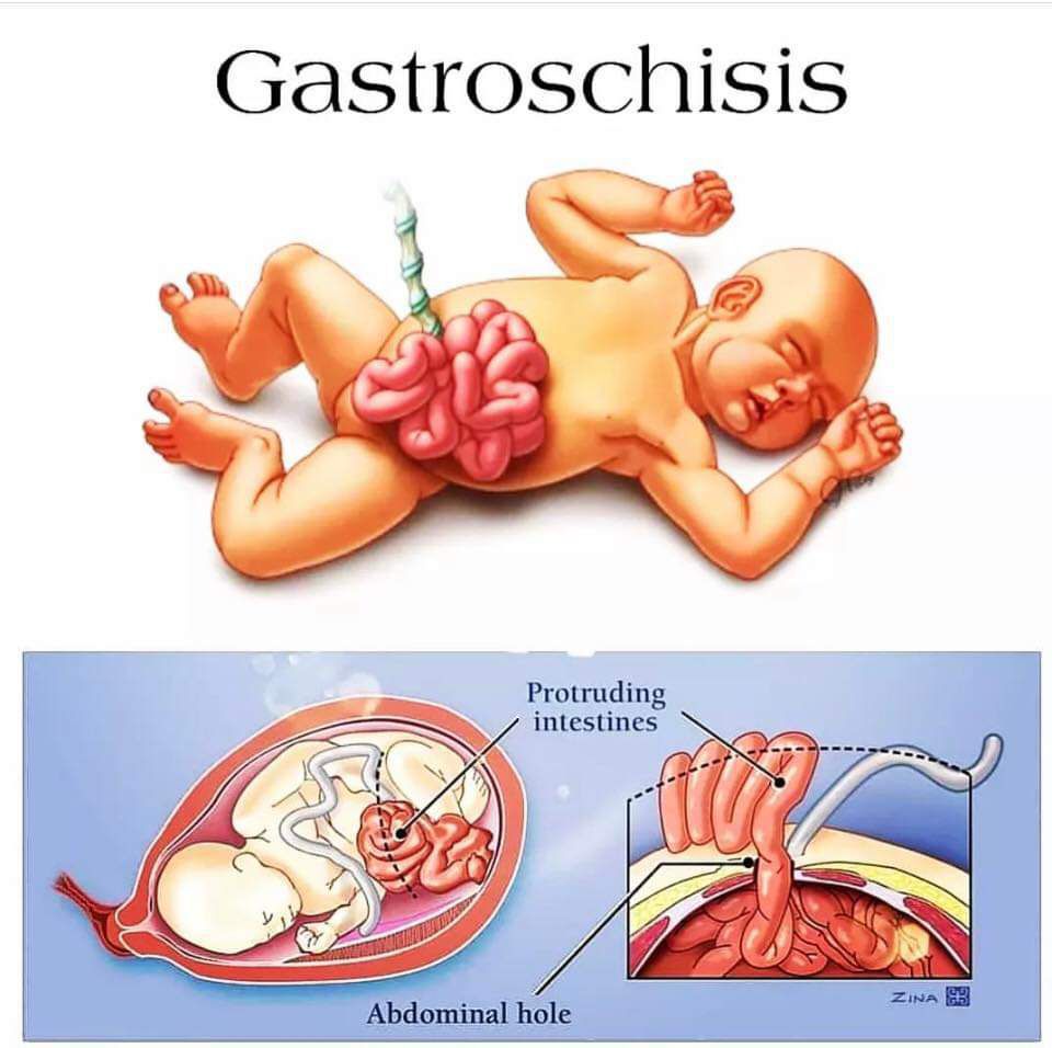 Gastroschisis :- (pronounced gas-troh-skee-sis) is a birth defect where there is a hole in the abdominal wall beside the belly button. The baby's intestines, and sometimes other organs, are found outside of the baby's body, exiting through the hole.