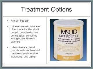 How Is Maple Syrup Urine Disease Treated? The main treatment for MSUD is a low-protein diet with low levels of the three amino acids. Babies with MSUD must be on a special formula as soon as possible. Then, they'll follow the special diet for the rest of their lives.