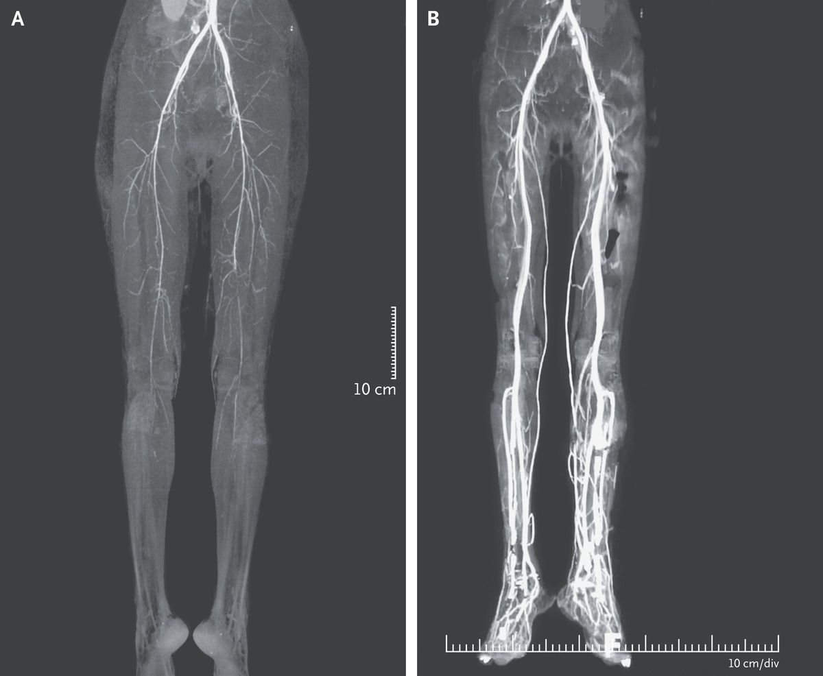 A 24-year-old woman presented to the outpatient clinic with a 2-day history of severe, burning leg pain. She had a history of congenital infection with the human immunodeficiency virus, for which she was taking tenofovir, emtricitabine, and lopinavir–ritonavir. Four days before presentation she had also started taking ergotamine twice daily for a migraine headache. The pain in the legs extended from the toes to the midthigh and was accompanied by discoloration of the feet and difficulty walking. On examination, both legs were cold, with nonpalpable popliteal and dorsalis pedis pulses. Computed tomographic (CT) angiography revealed diffuse, symmetric, luminal narrowing of the arteries below the external iliac artery in both legs (Panel A). A diagnosis of ergotism was suspected. Ritonavir inhibits the enzyme CYP3A4, leading to increased serum levels of ergotamine and thereby causing vasospastic limb ischemia. Treatment with intravenous prostaglandin and unfractionated heparin was initiated. The pain subsided, and patient’s legs became warmer, but she underwent amputation of the left second toe owing to gangrene. A repeat CT angiogram obtained 2 weeks after presentation showed improved perfusion in both legs (Panel B).