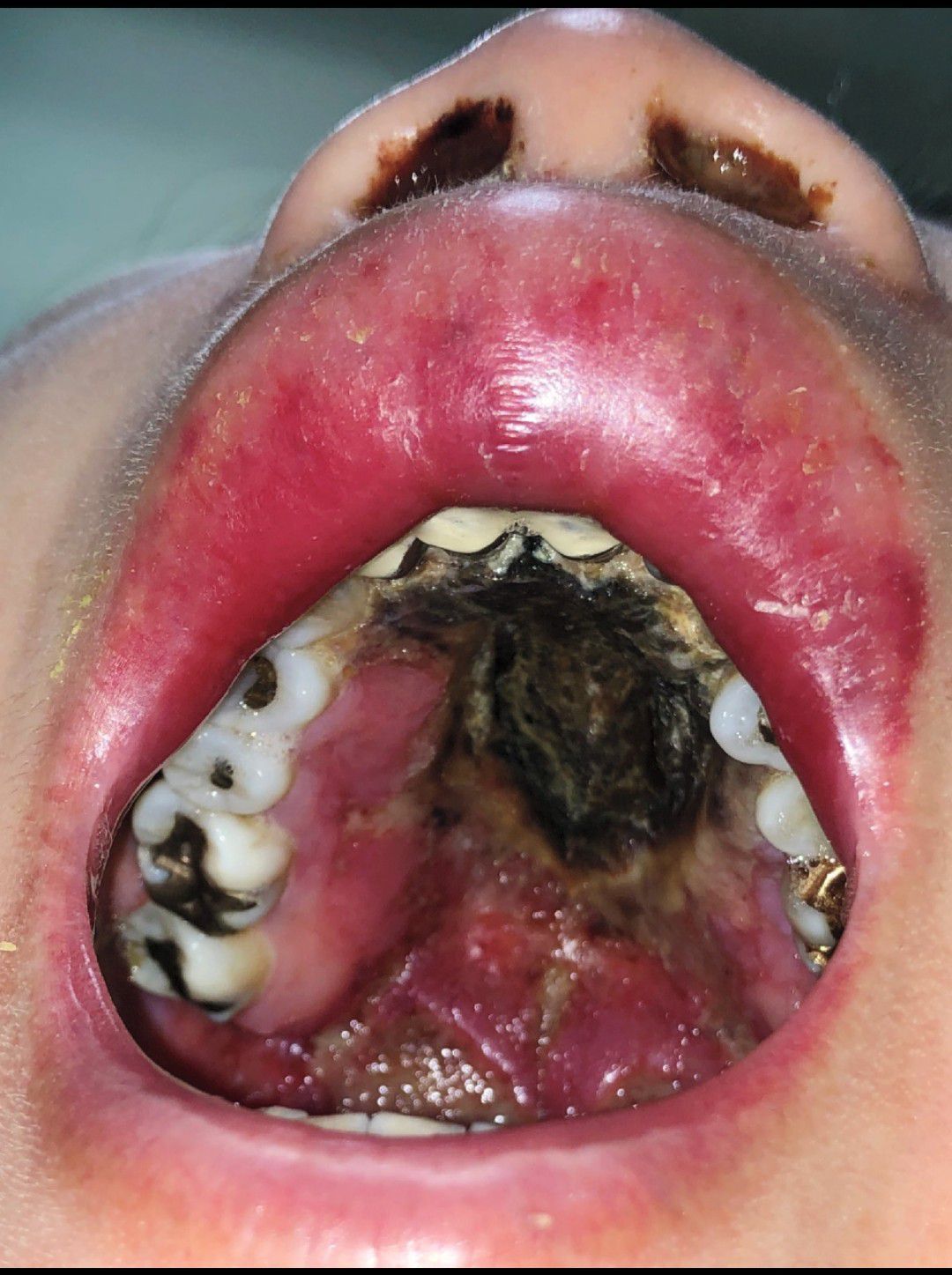 A 50-year-old woman presented to the dermatology clinic with a painless ulcer on her palate and a swollen lip, which were associated with intermittent fevers and general malaise. She had a 3-year history of nasal obstruction with purulent discharge, for which she had received treatment with intranasal glucocorticoids and antibiotic agents. Physical examination revealed a large ulcer with a necrotic base extending over the soft and hard palates. Surrounding erosions covered with fibrinoid exudate were noted, in addition to a swollen upper lip and discolored nasal discharge. The results of laboratory studies showed a white-cell count of 2200 per cubic millimeter (reference range, 4500 to 11,000), a hemoglobin level of 10.7 g per deciliter (reference range, 12 to 15), a platelet count of 65,000 per cubic milliliter (reference range, 150,000 to 400,000), and a ferritin level of 18,745 ng per milliliter (reference range, 12 to 263). Histopathological analysis of a biopsy specimen showed lymphoid proliferation with positive staining for CD3, CD56, and granzyme B, and Epstein–Barr virus was detected on in situ hybridization. A diagnosis of extranodal natural killer T-cell lymphoma, nasal type, was made. A bone marrow biopsy revealed evidence of hemophagocytosis, which is associated with this disease. Chemotherapy was initiated; however, the patient died 1 month later.