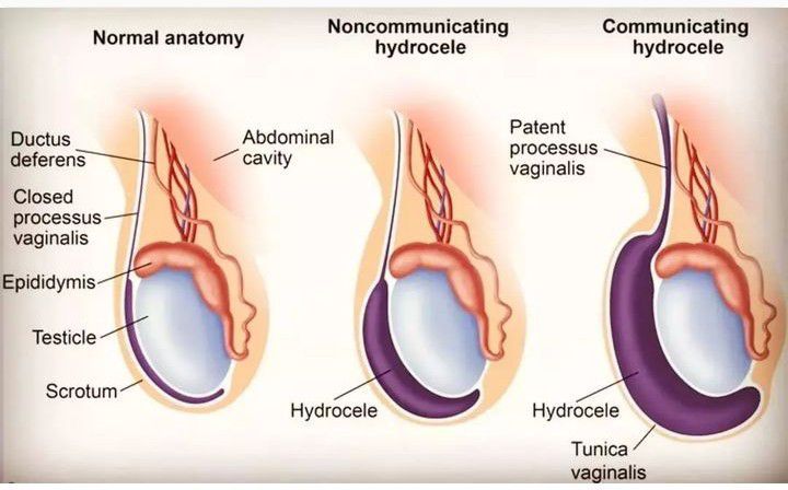 A collection of peritoneal fluid within the tunica vaginalis. During embryogenesis, the testis descends through the ingural canal, drawing with it a diverticulum of peritoneum into the scrotum. This peritoneal tissue is known as the processus vaginalis. Normally, the communication between the processus vaginalis and the peritoneum is obliterated, and the tunica vaginalis is the remaining tissue overlying the testis and epididymis. A communicating hydrocele results when the processus vaginalis remains patent and allows peritoneal fluid to accumulate in the tunica vaginalis. This type of hydrocele is common in newborns and presents as a painless scrotal swelling that transilluminates.