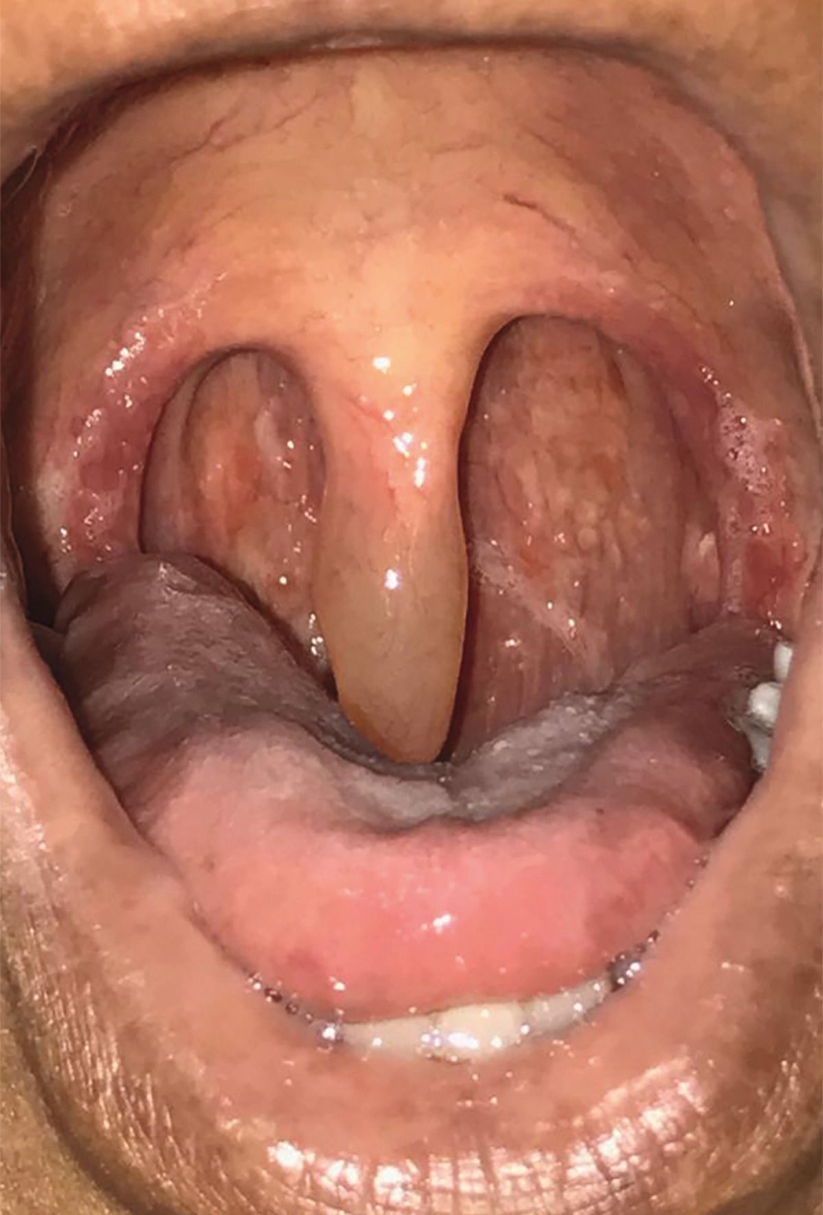 A 61-year-old man presented to the hematology department with progressive difficulty in swallowing food. He also described a 2-year history of edema in his hands and face as well as dry skin and hair loss. Physical examination of the oropharynx showed macroglossia with posterior scalloping, erythema of the palatoglossal arch, and an enlarged uvula. Biopsy of the uvula was performed, and staining with Congo red showed apple-green birefringence suggestive of amyloid deposits. Immunohistochemical analysis showed high circulating levels of kappa light chain. Serum electrophoresis with immunofixation revealed a monoclonal spike of 0.4 g per deciliter. Additional evaluation was notable for a level of free kappa light chain of 56.6 mg per liter (reference range, 8.3 to 27.0), an elevated ratio of kappa to lambda light chains of 3.3 (reference range, 0.26 to 1.65), and proteinuria (0.26 g of protein in a 24-hour urine sample). Flow cytometry of bone marrow showed 0.54% plasma cells with an atypical phenotype, and cardiac magnetic resonance imaging was suggestive of amyloid involvement in the left ventricular myocardium. Amyloidosis is characterized by deposition of abnormal proteins in extracellular tissue; in the light-chain form of the disease, the extracellular tissue is derived from immunoglobulin light chains associated with a plasma-cell dyscrasia. The patient underwent autologous bone marrow transplantation and had a complete response.