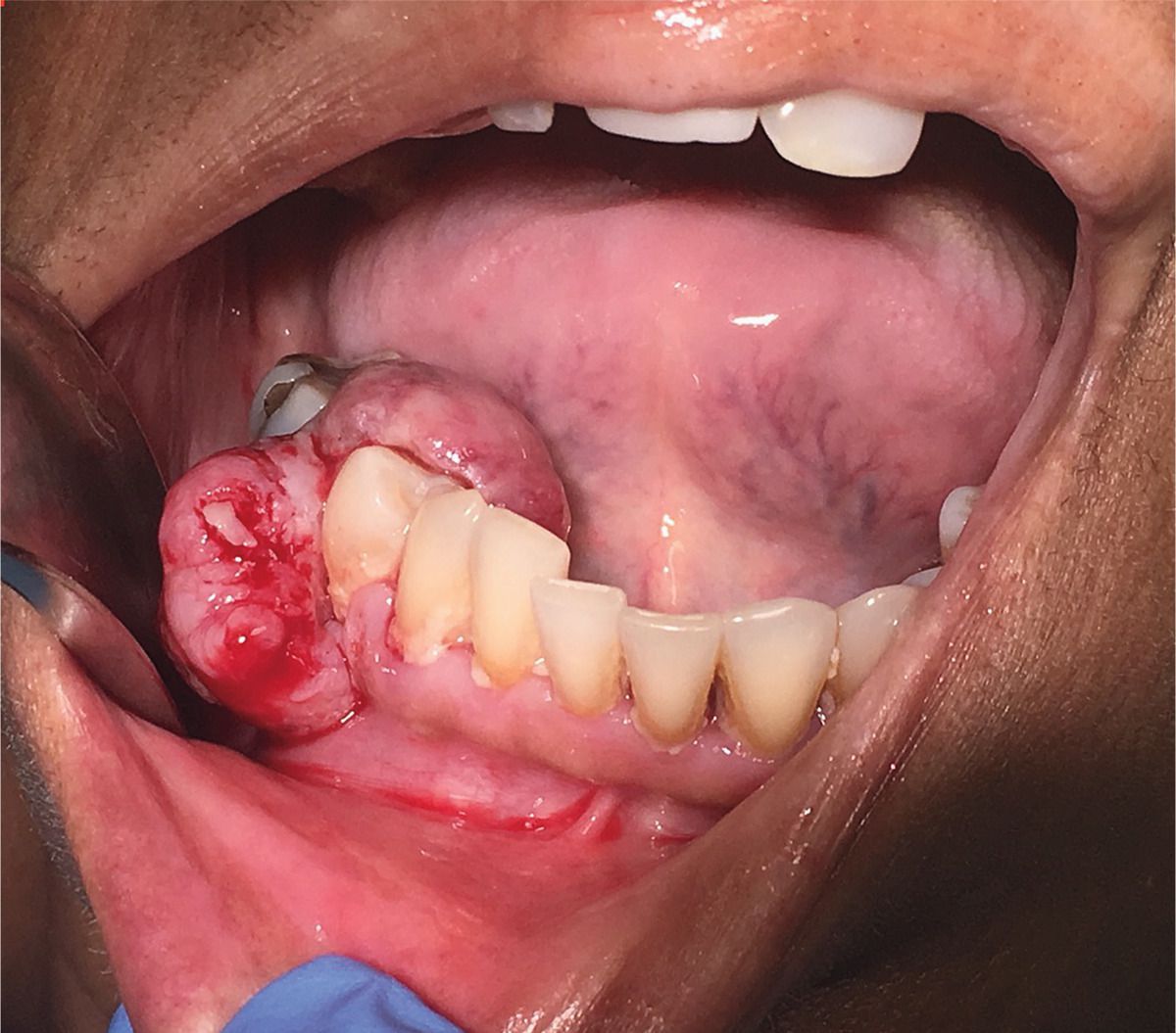 A 60-year-old woman presented to the oral surgery clinic with gingival swelling. She had a history of colorectal cancer, which had been diagnosed a year earlier, for which she had undergone surgery and received chemotherapy. She first noticed the mass after bleeding occurred while she was brushing her teeth. On examination, a large, nontender, pedunculated mass was seen extending from the buccal gingival border of the lower right second premolar to the lingual border. The surface was friable, and dental indentations on the occlusal aspect suggested chronicity. An excisional biopsy was performed, and histopathological analysis showed an infiltrating tumor, consistent with adenocarcinoma, probably of colorectal origin. At a follow-up visit 2 weeks later, further debulking of the tumor was performed. Positron-emission tomography showed multiple visceral metastases. The most common sites of metastasis of colorectal adenocarcinoma are the liver and lungs; metastatic lesions in the oral cavity are unusual. The patient was enrolled in a clinical trial of a chemotherapy regimen but was eventually lost to follow-up.