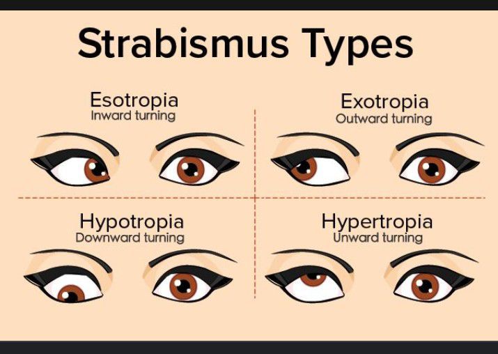 There are 4 types of Strabismus Inward turning (esotropia) Outward turning (exotropia) Upward turning (hypertropia) Downward turning (hypotropia)