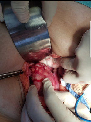 Advance uterus cancer on a 76 year old woman that presented with abdominal pain, vaginal bleeding and history of weight loss and constipation. The malignancy had taken all over the uterus and its posterior wall not allowing the removal of the uterus. We also found metastasis to the lungs. Really bad prognosis. Because of the obtruction and the failure to treat the primary cause we decided to do a colostomy to help relife and prevent a more severe bowl obstruction.