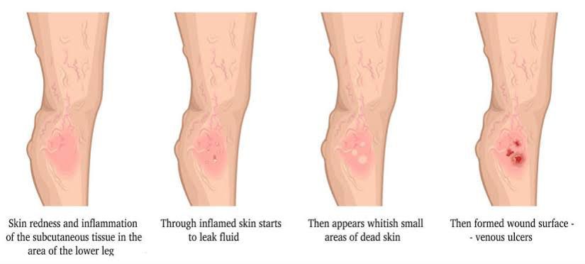 A leg ulcer is a long-lasting (chronic) sore that takes more than 4 to 6 weeks to heal. They usually develop on the inside of the leg, just above the ankle. The symptoms of a venous leg ulcer include pain, itching and swelling in the affected leg. There may also be discoloured or hardened skin around the ulcer, and the sore may produce a foul-smelling discharge. See your GP if you think you have a leg ulcer, as it will need specialist treatment to help it heal. Your GP will examine your leg and may carry out additional tests to rule out other conditions.