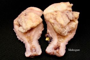 “Uterus with large carcinosarcoma which fills the uterine cavity and invades superficially into the myometrium”. •Now what is Carcinosarcoma ? Carcinosarcoma is a malignant tumour composed of carcinoma(Epithelial cancer) and sarcoma (cancer of connective tissues) extensively intermixed.These tumours are also called “Malignant Mixed Mullerian Tumours”. They typically arise within the endometrial cavity but, in rare cases, they may arise in the cervix. •Risk factors: Risk factors for the development of carcinosarcoma are similar to those of endometrial carcinoma and include nulliparity, advanced age, obesity, exposure to exogenous estrogens, and long-term use of tamoxifen. •Treatment: To date, no national consensus guidelines have been established for the management of uterine carcinosarcomas but the following methods are considered to take effect upto some extent: 1. Radiotherapy. 2. Chemotherapy. 3. Treating the patient with certain anti-cancerous drugs. If the above treatment options fail to work then the uterus is totally removed surgically, Called Hysterectomy.