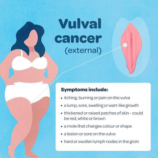 Symptoms of vulval cancer can include: a persistent itch in the vulva pain, soreness or tenderness in the vulva raised and thickened patches of skin that can be red, white or dark a lump or wart-like growth on the vulva bleeding from the vulva or blood-stained vaginal discharge between periods an open sore in the vulva a burning pain when passing urine a mole on the vulva that changes shape or colour Speak to your GP if you notice any changes in the usual appearance of your vulva. While it's highly unlikely to be the result of cancer, these changes should be investigated.