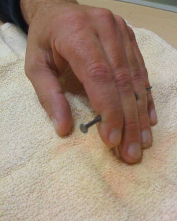 Treatment of a retained nail following nail-gun injury adheres to standard principles of wound management. A single dose of intravenous or intramuscular antibiotics is often administered, usually a first-generation cephalosporin to cover skin flora contamination in uncomplicated cases. Regional blocks are usually sufficient for wound exploration and debridement. The wound and surrounding soft tissues are thoroughly irrigated with isotonic sodium chloride solution with or without the addition of antimicrobial agents. Exploration for removal of foreign material and to avoid secondary injury from nail extraction should be considered.