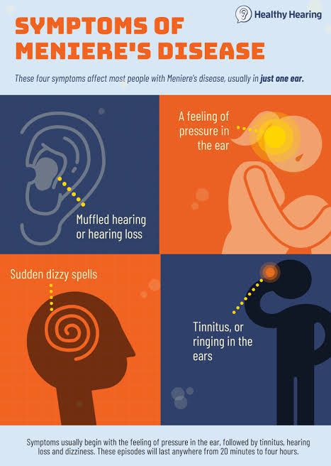 feel dizziness with a spinning sensation (vertigo) feel unsteady on your feet. feel sick (nausea) or be sick (vomit) hear ringing, roaring or buzzing inside your ear. have a sudden drop in hearing.