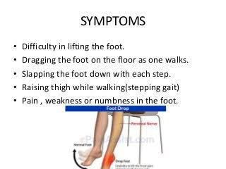 Foot drop makes it difficult to lift the front part of your foot, so it might drag on the floor when you walk. This can cause you to raise your thigh when you walk, as though climbing stairs (steppage gait), to help your foot clear the floor.