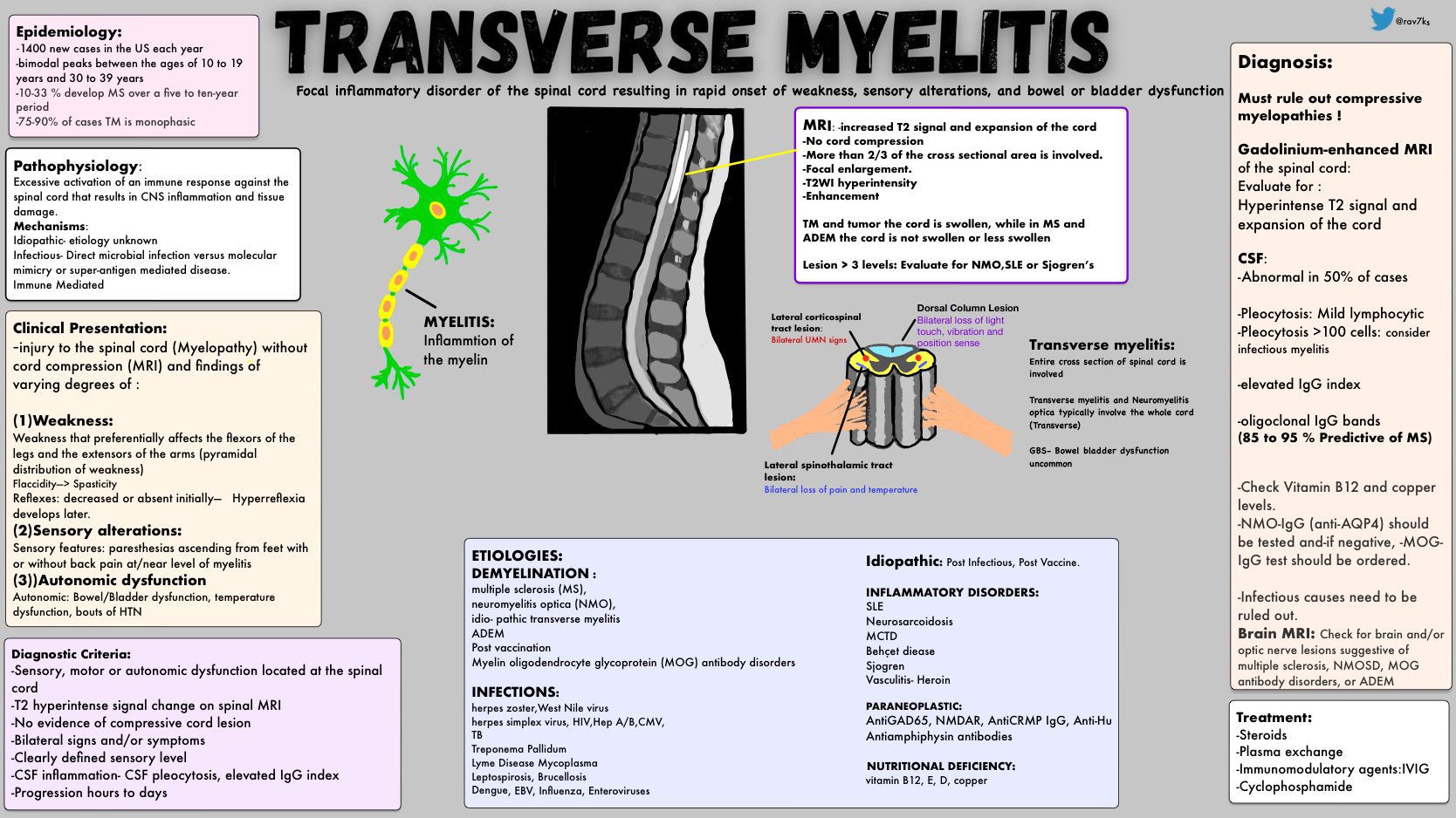 Viral, bacterial and fungal infections affecting the spinal cord may cause transverse myelitis. In most cases, the inflammatory disorder appears after recovery from the infection. Viruses associated with transverse myelitis are: Herpes viruses, including the one that causes shingles and chickenpox (zoster)