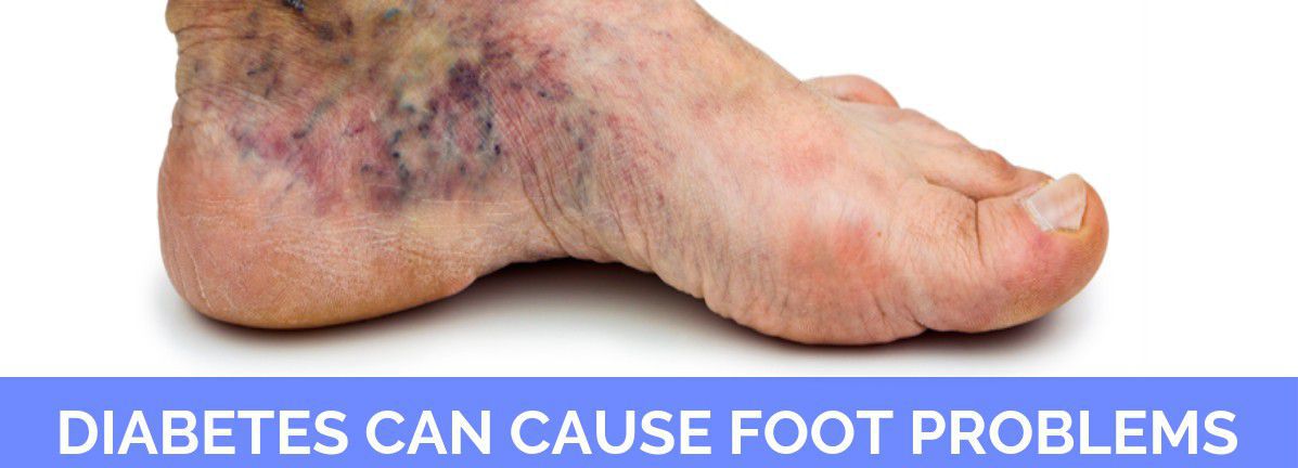 How does diabetes cause foot problems? Foot problems are common in people with diabetes. They can happen over time when high blood sugar damages the nerves and blood vessels in the feet. The nerve damage, called diabetic neuropathy, can cause numbness, tingling, pain, or a loss of feeling in your feet.