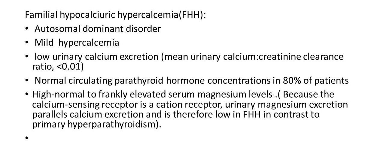 Familial hypocalciuric hypercalcemia (FHH) is a rare autosomal dominant condition. It occurs as a result of mutations in the calcium-sensing receptor gene (CASR) that lead to decreased receptor activity. Patients typically have mild hypercalcemia, hypocalciuria, hypermagnesemia, and hypophosphatemia.