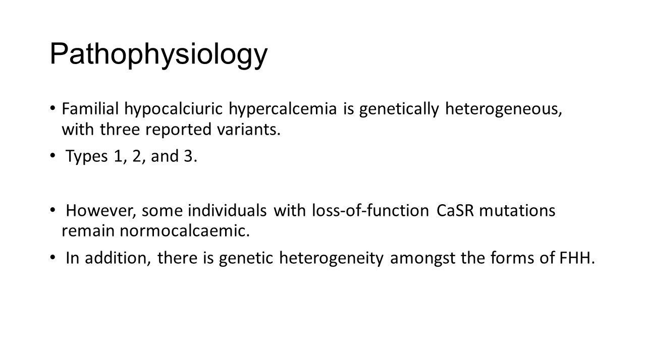 The pathophysiology of familial hypocalciuric hypercalcemia (FHH) consists of an inactivating missense mutation in the calcium-sensing receptor (CaSR) located on the short arm of the chromosome 3 (FBHH3q). The mutation of CaSR is associated with two inherited conditions FHH and neonatal hyperparathyroidism