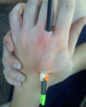 This material contains content which some users might find distrubingA case of accidental, self-inflicted injury to the hand from shooting a bow and arrow.