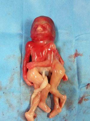 20 Wk Cephalothoracopagus conjoint twins having 4 arms, 4 legs, 2 genitalia (Both identical female) Ultrasound shows two spinal cord, single heart & a head with two cerebrum.