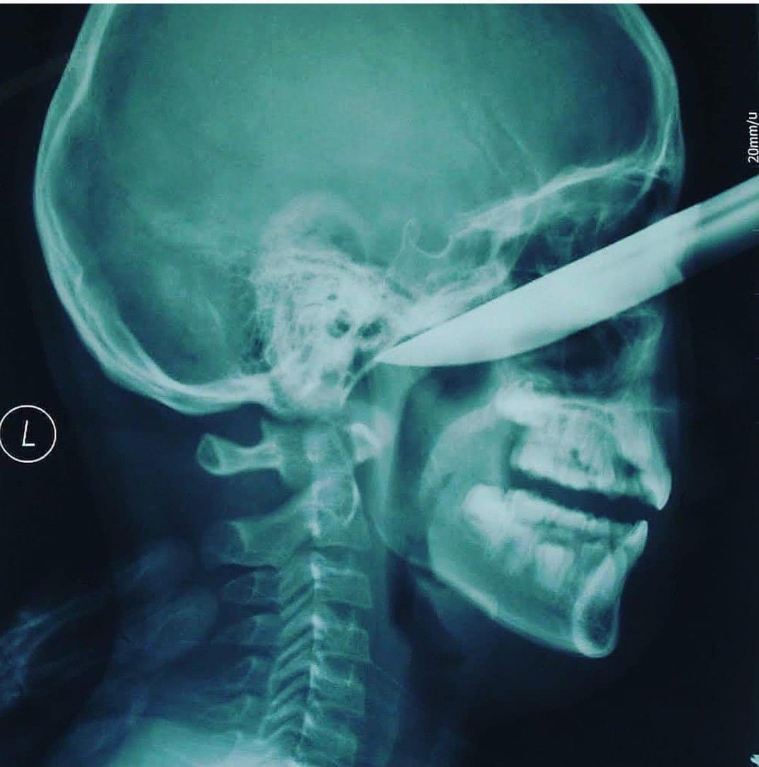 A Chinese teenager slipped and stabbed himself in the face with a 7 cm knife while peeling an apple. Boy’s father recalled: "He was walking to the sofa while peeling the apple. Suddenly he slipped down and his face hit onto the sharp knife. I dared not pull out the knife as my son was screaming." Chief surgeon who operated to remove the knife, commented: "It's shocking. The knife, which is more than 20cm long, penetrated 7cm into his face. The surgery was successful and the patient could recover fully in a month.