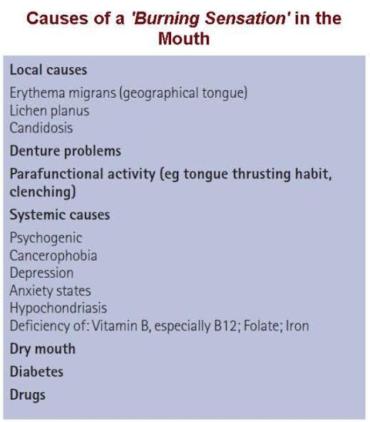 The cause of burning mouth syndrome can be classified as either primary or secondary. Primary burning mouth syndrome When no clinical or lab abnormalities can be identified, the condition is called primary or idiopathic burning mouth syndrome. Some research suggests that primary burning mouth syndrome is related to problems with taste and sensory nerves of the peripheral or central nervous system. Secondary burning mouth syndrome Sometimes burning mouth syndrome is caused by an underlying medical condition. In these cases, it's called secondary burning mouth syndrome. Underlying problems that may be linked to secondary burning mouth syndrome include: Dry mouth (xerostomia), which can be caused by various medications, health problems, problems with salivary gland function or the side effects of cancer treatment Other oral conditions, such as a fungal infection of the mouth (oral thrush), an inflammatory condition called oral lichen planus or a condition called geographic tongue that gives the tongue a maplike appearance Nutritional deficiencies, such as a lack of iron, zinc, folate (vitamin B-9), thiamin (vitamin B-1), riboflavin (vitamin B-2), pyridoxine (vitamin B-6) and cobalamin (vitamin B-12) Allergies or reactions to foods, food flavorings, other food additives, fragrances, dyes or dental-work substances Reflux of stomach acid (gastroesophageal reflux disease, or GERD) that enters your mouth from your stomach Certain medications, particularly high blood pressure medications Oral habits, such as tongue thrusting, biting the tip of the tongue and teeth grinding (bruxism) Endocrine disorders, such as diabetes or underactive thyroid (hypothyroidism) Excessive mouth irritation, which may result from overbrushing your tongue, using abrasive toothpastes, overusing mouthwashes or having too many acidic drinks Psychological factors, such as anxiety, depression or stress Wearing dentures, even if they don't fit well and cause irritation, doesn't generally cause burning mouth syndrome, but dentures can make symptoms worse.